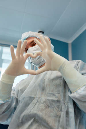 female surgeon doctor wearing protective mask and hat during the operation. Healthcare, medical education, emergency medical service, surgery concept.