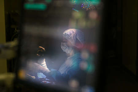 Operating room, portrait of a surgeon between computers Evele and Cardio, blue light. real operation. Beautiful light. Copy space.