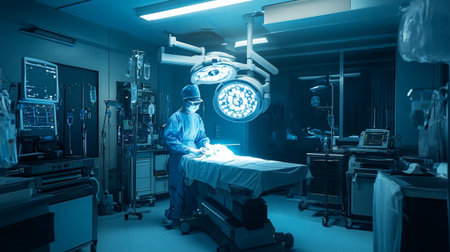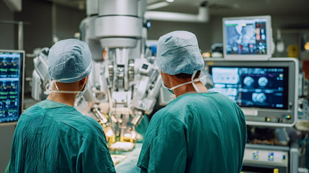 Medical specialists supervising advanced robotic system in modern operating room, implementing innovative surgical technology for precise and efficient healthcare procedures
