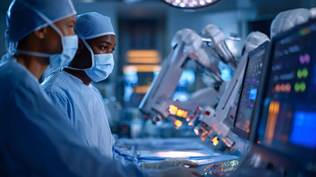 Surgeons in scrubs and masks monitor a robotic arm performing a precise surgical procedure in a high tech operating room with digital screens showing patient data and anatomy