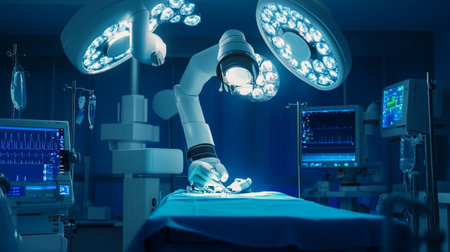 a surgeon controls a robotic surgery system in a modern operating room with bright surgical lights above it.