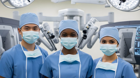 Medical team monitoring controls of a surgical robot, conducting a high tech operation in a sterile operating room, representing advanced healthcare technology and precision surgery