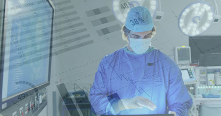 Image of financial data processing over caucasian male surgeon in hospital. Global medicine, healthcare, computing and digital interface concept digitally generated image.