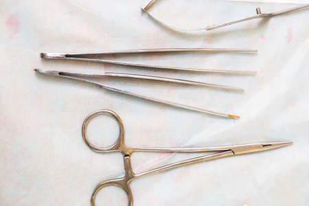 surgical instruments and tools including scalpels, forceps and tweezers arranged on a table for a surgery