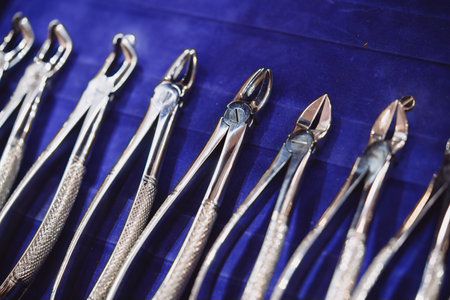 Dentist Instruments and Tools lie on the table. Set of metal medical surgical equipment for tooth extraction. Shifted focus.