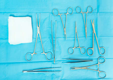 Set of sterile instruments laid out on the table for an operation on a blue cloth