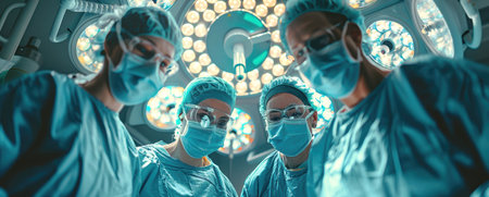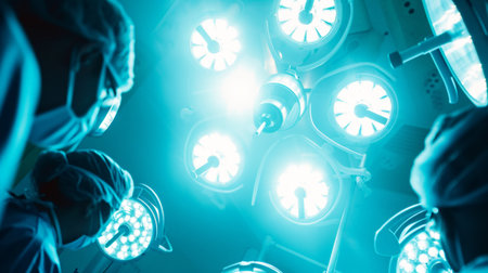 Bright surgical lights illuminate a group of skilled doctors who are intently focused on a complex surgical procedure. Dressed in gowns and masks, they work together with precision and care.