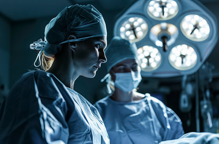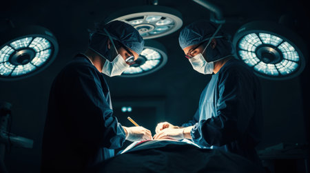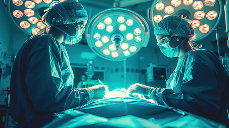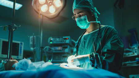 Surgeon performing a delicate operation in a modern operating room during a nighttime procedure