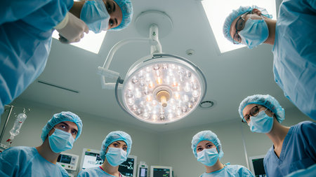A group of surgeons, clad in blue surgical gowns and masks, work intently under a bright surgical light. The scene captures their focused expressions illuminated by the cool blue and white lighting, creating a dramatic and intense atmosphere in the sterile operating room. The camera angle from below emphasizes the seriousness and concentration required in this life-saving procedure.