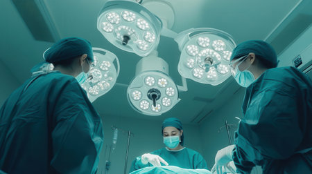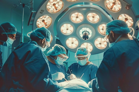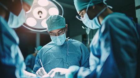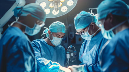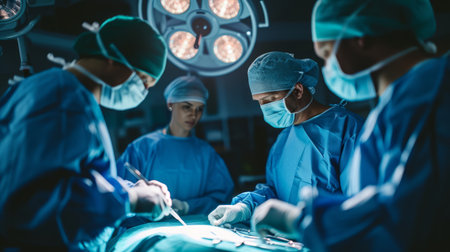 A focused surgical team collaborates in a modern operating room to perform a vital medical procedure, emphasizing teamwork, skill, and precision.