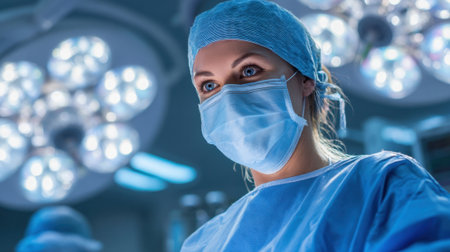 professional surgeon in blue scrubs and a surgical mask, performing a delicate operation under bright operating room.