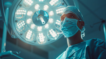 Surgeon doctor performing operation using special lamp lighting, wearing blue surgical mask