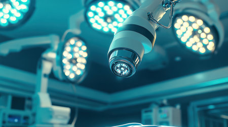 A surgical robotic arm with bright operating room lights in futuristic medical environment, showcasing advanced technology and precision care