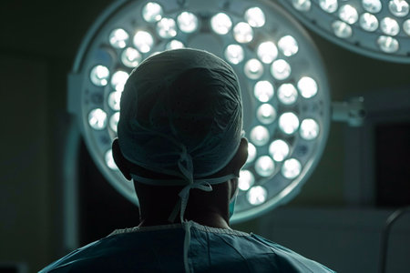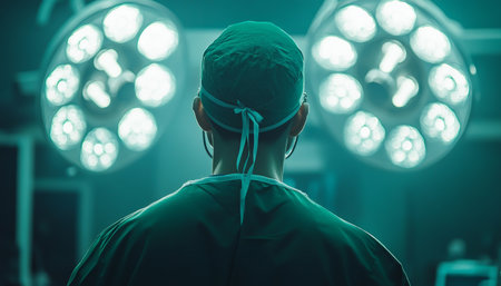Surgeon in green cap and glasses in operating room, back view with bright surgical lights