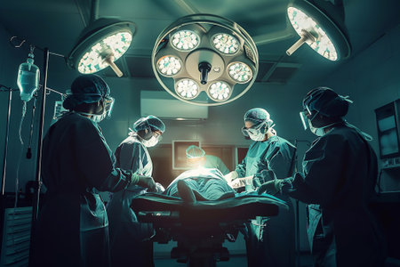 A skilled medical team concentrates on a surgical procedure in an operating room filled with bright lights, showcasing the dedication and precision required in healthcare.