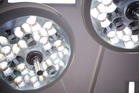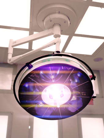 Surgical shadowless lamp in the equipped room on the background of group working surgeon.