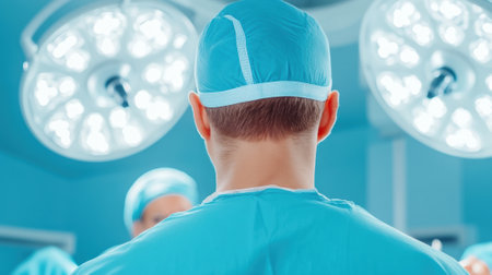 Photorealistic rear view of a surgical procedure in progress, illuminated by sterile, bright surgical lights, with surgeons in blue scrubs and gloves meticulously working, showcasing precision and focus