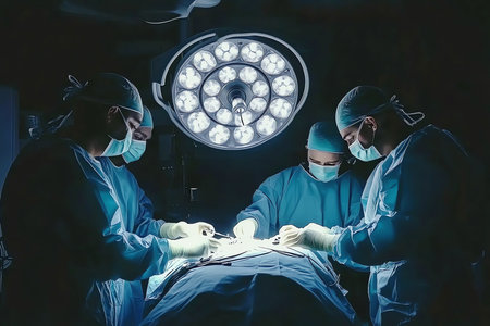 Three surgeons concentrate intently during a critical surgical procedure in a dimly lit operating room, showcasing the dedication and teamwork necessary in medicine.