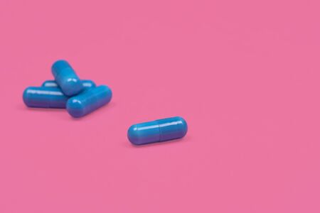 Medical background. Blue capsule pill on pink background. Blue capsules pill spread on fuchsia or pink background with copy space. Macro photo
