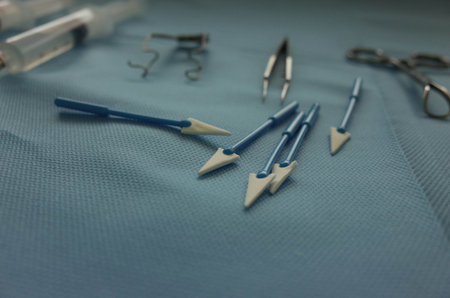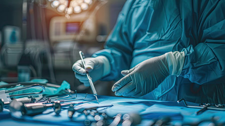 A meticulously arranged set of sterile surgical instruments lies ready on a blue drape, awaiting the start of a critical medical procedure. This scene captures the precision, preparation, and gravity of the operating room environment, symbolizing the intersection of technology and human skill in modern healthcare.