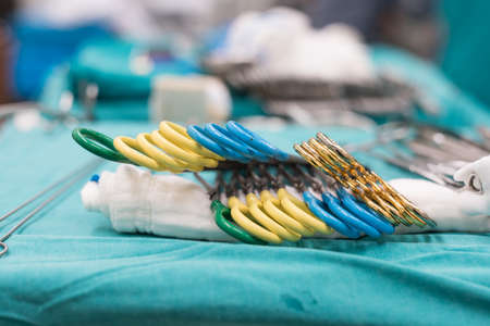 Top view of sterile surgical instruments for surgery procedure inside operation room at modern hospital - Focus on equipment