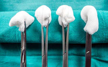 Scissors surgical with torundas in an operating theater, composition horizontal, conceptual image