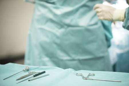 surgical instruments and tools including scalpels, forceps and tweezers arranged on a table for a surgery
