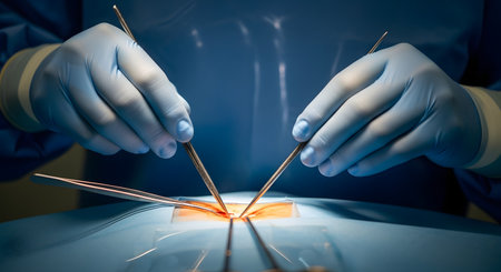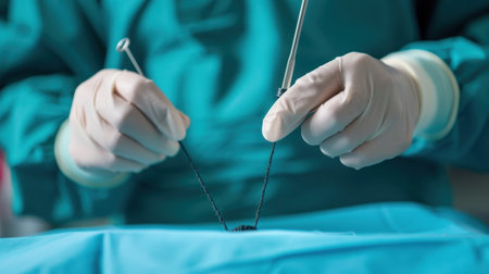 Close-up view of a surgeon's gloved hands performing stitch work on a patient in an operating room, emphasizing precision and medical professionalism.
