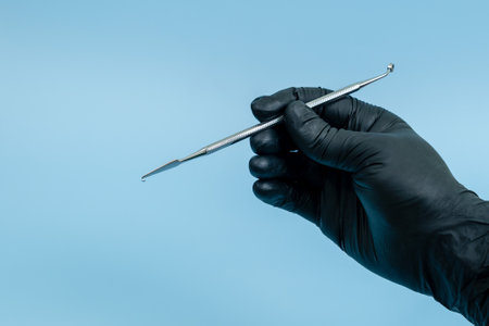 Cropped shot of professional dentist in black medical gloves with dental tool. Dental concept. Isolated on blue background