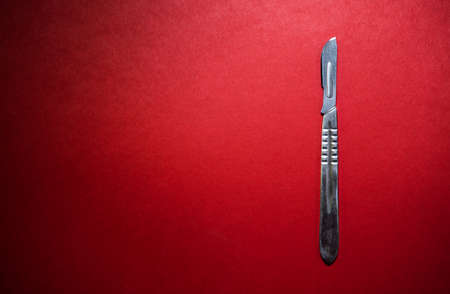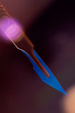 Surgical steel simple shiny scalpel in the surgeon's hand against the background of the operation. The faces of the people in the background are unrecognizable in full blur. Conceptual photography. Symbol of surgery, doctor