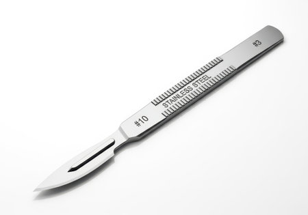 A skilled surgeon holds a scalpel over a marked surgical area, emphasizing precision and care in a clinical environment. The blue lighting enhances the focus on the delicate procedure.