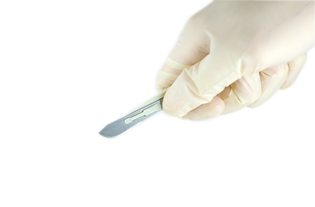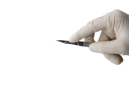 Surgery knife holding on the white background, studio shot. Operation equipment. White glove.