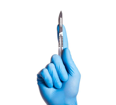 Hand of surgeon in blue medical glove holding a scalpel, isolated on a white background