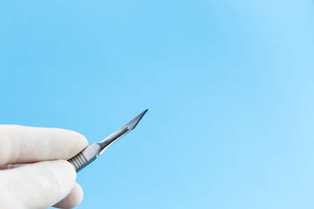 Scalpel in doctors hands in white medical gloves isolated on blue background copy space. Studio Shot
