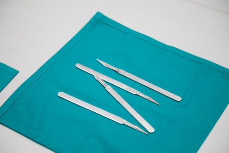 A collection of surgical instruments meticulously arranged on a blue cloth surface captures the essence of medical precision and professionalism in healthcare settings.