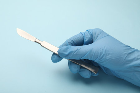 Doctor with surgical scalpel on light blue background, closeup. Space for text