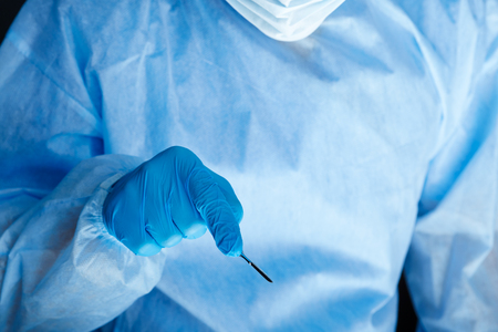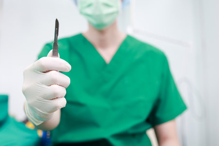 Professional doctor surgeon holding scalpel in operation room at hospital. Medical and pharmaceutical concept. Scalpel surgeon's scissors, just before surgery