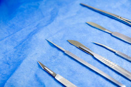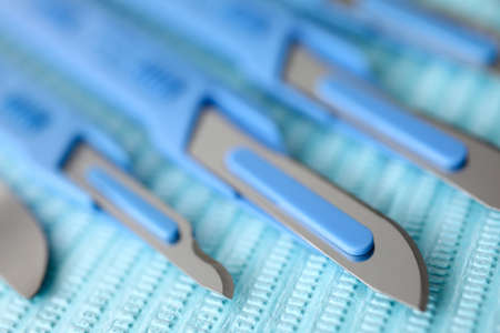 Close up set new surgical scalpels for surgery. No need for large cuts. Minimal injuries and blood loss. Conducting modern medical operations any degree complexity by qualified surgeons