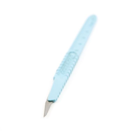 A close-up view of a hand wearing a blue medical glove holding a sterile surgical scalpel, presented on a clean white background.