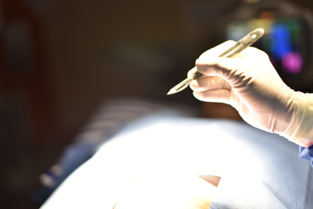 Surgeon hand holding surgical scalpel while operating patient in surgical theatre closeup. Resuscitation medicine team holding steel medical tools saving patient. Surgery and emergency concept