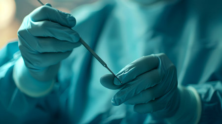 This high definition image showcases the hands of a skilled surgeon wearing surgical gloves and firmly gripping a sharp scalpel The instrument is in crisp focus while the clean blurred backdrop