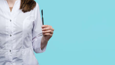 A woman in a medical mask holds a surgical scalpel in her hand on a white background