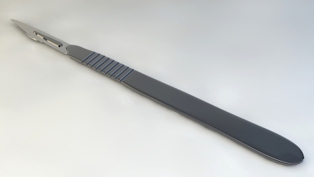 Ready to cut - Doctor's hand with a new disposable scalpel in front of a clinic room