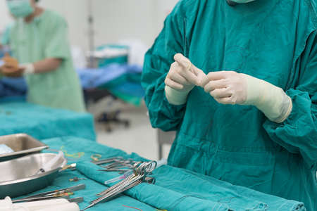Asian male surgeon doctor is wearing surgical gloves before the surgery in operating room. Close up hands of doctor in green clothes putting on gloves.