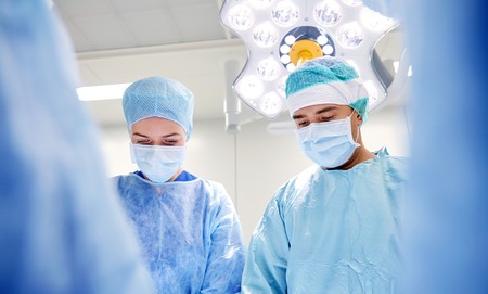 Group of surgeons at operation in operating room at hospital. Surgery, medicine and people concept