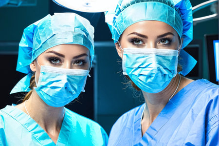 A female medical professional in a blue surgical mask standing in an operating room. Ai generated
