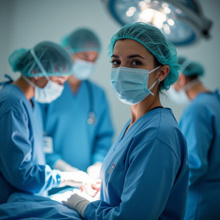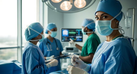Medical professionals collaborate in a sterile operating room, ensuring precision and care during a surgical procedure. Modern technology supports patient safety.