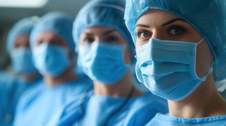 Focused and determined medical professionals in scrubs and surgical masks, ready for a procedure, with a strong sense of teamwork.