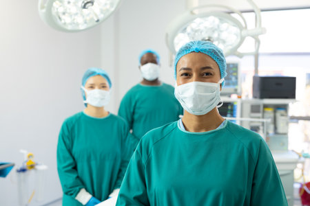 Portrait of diverse male and female doctors wearing face masks in hospital operating room. Medicine, healthcare and medical services, unaltered.