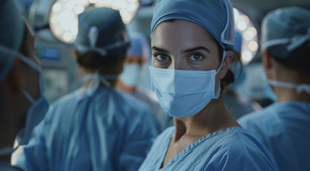 Attentive Female Surgeon with Surgical Team Poised Behind, Under the Bright Lights of the Operating Theater.